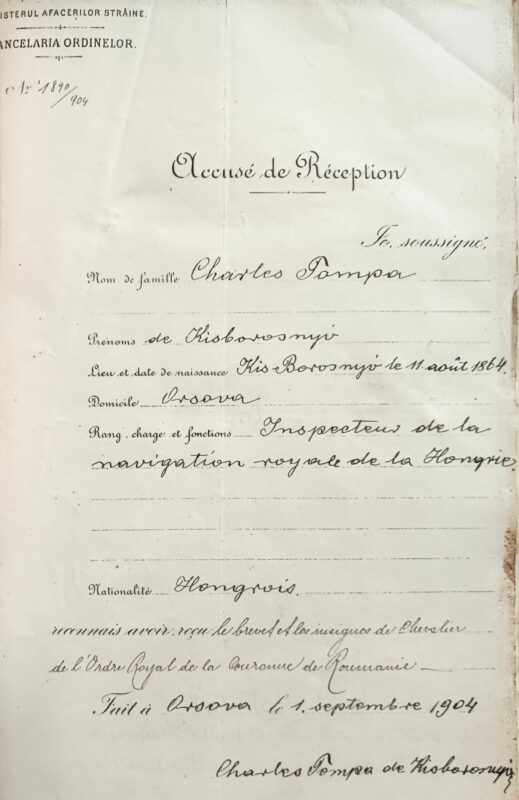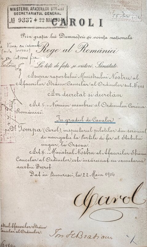 Urmare a raportului lui Ion I. C. Brătianu, ministrul Afacerilor Străine, cancelar al Ordinelor, nr. 9.328 din mai 1904, regele Carol I a semnat în București, la 22 mai 1904, decretul nr. 1890, prin care a conferit lui Tompa Carol, inspectorul piloților din serviciul de navigație la Porțile de Fier al Statului Ungar, la Orșova, Ordinul „Coroana României” în gradul de Cavaler. Potrivit adeverinței de primire a brevetului și însemnelor de Cavaler al Ordinului „Coroana României”, semnată la Orșova, în 1 septembrie 1904, Tompa Carol s-a născut la 11 august 1864, în Boroșneu Mic (Kisborosnyó) și își avea domiciliul în Orșova.