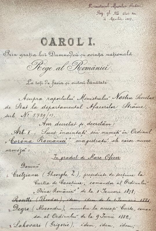 În urma intervenirii ministrului Justiției și ca urmare a raportului lui M. Pherekyde, ministrul Afacerilor Străine, cancelar al Ordinelor, nr. 5.729 din 3 aprilie 1887, regele Carol I a semnat în București, la 8 aprilie 1887, decretul nr. 1.157, prin care a conferit lui Ioan B. Doxescu, prim-procuror pe lângă Tribunalul Mehedinți, Ordinul „Coroana României” în gradul de Cavaler. Prin același decret regal, decorația a mai fost acordată și altor persoane atât în gradul amintit mai înainte, cât și în gradele de Mare Ofițer, de Comandor și de Ofițer.