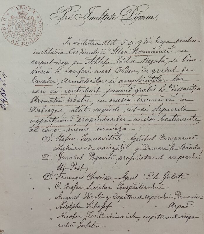 În adresa nr. 4 din 19 ianuarie 1880, către ministrul Afacerilor Străine, Inspectorul Porturilor Maritime și Fluviale menționează: „Cu ocazia trecerii trupelor noastre în Dobrogea pentru ocuparea acestei provincii, mijloacele de transport pe apă ale Flotilei nefiind suficiente pentru trecerea și transportarea întregii Divizii Active compusă din 10 mii oameni, cu caii, tunuri și bagaje, Ministerul de Externe aluat inițiativa și s-a adresat la diferiți proprietari de bastimente , rugându-i a ne pune vasele D-lor la dispoziție. În adevăr mai mulți Dni armatori s-au grăbit a da gratis atât vapoare, cât și șlepurile trebuincioase, și numai cu aceste ajutoare s-au putut transporta trupele române în Dobrogea pe la diferite porturi…