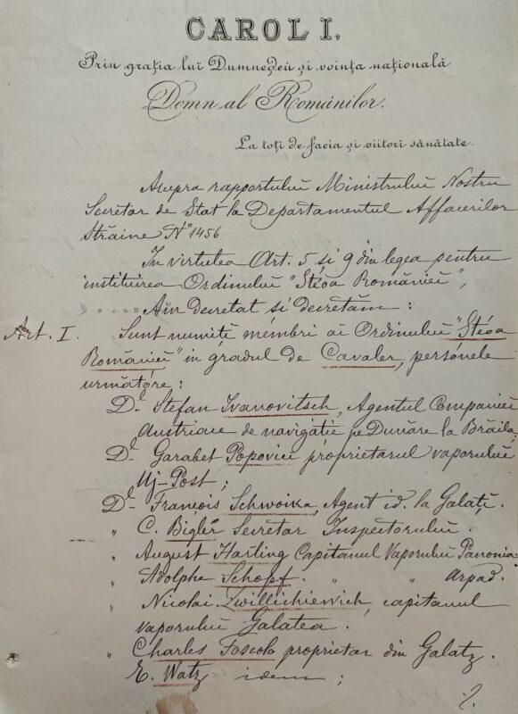 Apoi, urmare a raportului lui V. Boerescu, ministrul Afacerilor Străine, cancelar al Ordinelor, nr. 1456 din 1880, Carol I a semnat în București, la 4 februarie 1880, decretul nr. 290, prin care i-a numit membri ai Ordinului „Steaua României” în gradul de Cavaler, printre alții, pe August Harling, căpitanul vaporului Panonia, pe Adolphe Schopf, căpitanul vaporului Arpad și pe Nicolas Zwillichievich, căpitanul vaporului Galatea.
