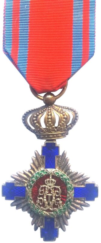 Crucea, cu smalț albastru, este de argint pentru Cavaleri și de aur pentru Ofițeri, Comandori, Mari-Ofițeri și Mari-Cruci. Diametrul este de 40 milimetri pentru Cavaleri și Ofițeri și de 60 milimetri pentru Comandori și Mari-Ofițeri. Cavalerii poartă decorațiunea pe partea stângă a pieptului, atârnată de o cordea moarată roșie, cu marginile albastre-închise, fără rozetă”.
