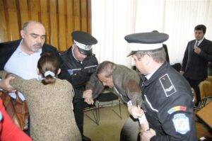 pe un scaun, a soţilor Olteanu, cei care strigă „Jos!“ de ceva vreme prin faţa Prefecturii i-a speriat pe unii aleşi locali. În aşa hal încât nici n-au mai venit în sala de şedinţă. Aceeaşi atitudine a avut-o şi Executivul Primăriei. Cu toate acestea, la un moment dat a intervenit POLIŢIA LOCALĂ şi a încercat, CU FORŢA, să-i scoată afară din sală pe soţii Olteanu. Fără ca aceştia să facă nimic. Probabil că poliţiştii locali aveau informaţii cum că se pregătea o chestie gen „Cornel Folescu“ dar, de aici şi până la a ABUZA DE FORŢĂ ca să scoţi doi simpli cetăţeni afară dintr-o sală e prea mult. S-a dat, astfel, „apă la moara unora“, iar ceea ce s-a întâmplat ieri e de domeniul penibilului, să târăşti şi să forţezi doi oameni să părăsească o sală pentru simplul motiv că sunt… CETĂŢENI! Halal!, ce n-a reuşit Opoziţia în patru ani de mandat a reuşit familia Olteanu: să dea o palmă, pe drept, unui obraz lipsă!