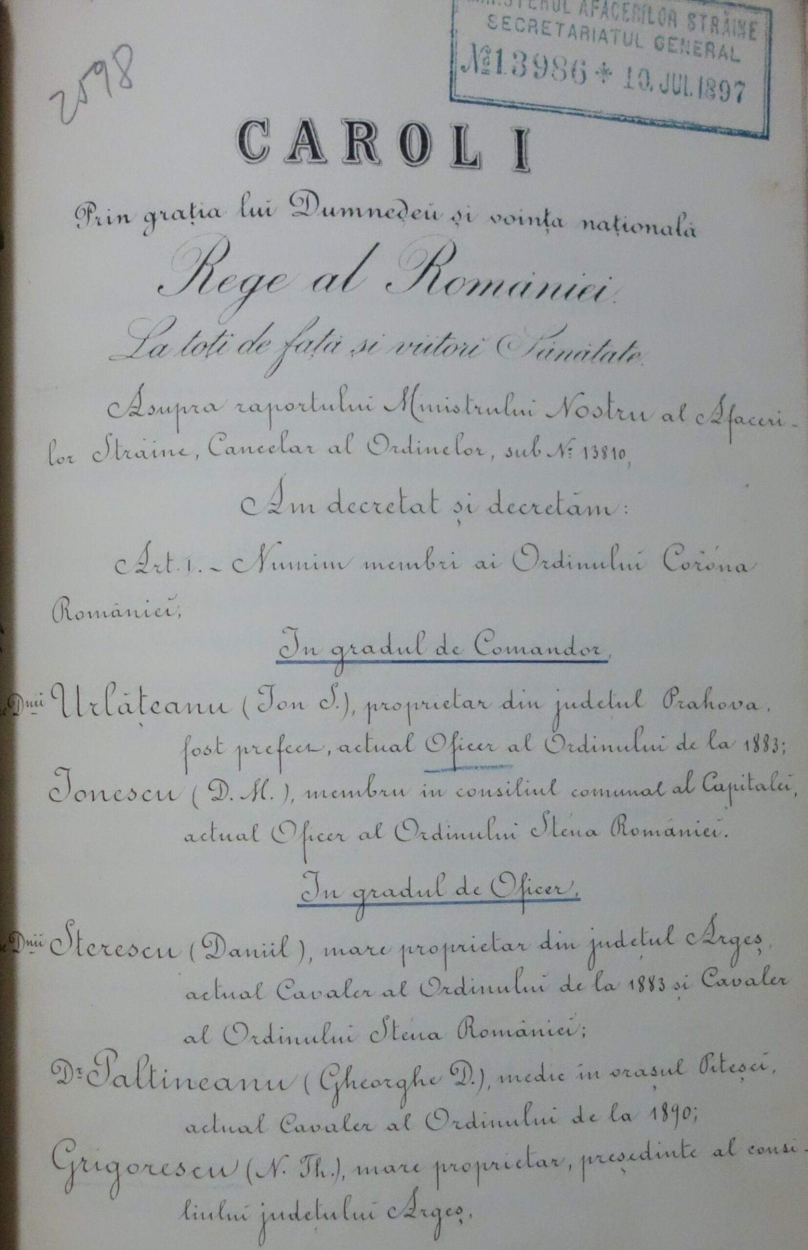 Cancelaria Ordinelor, dosar nr. 60/1897 (documentul) și de la Muzeul Jandarmeriei Române (decorația). Ordinul „Coroana României” a fost instituit prin legea din 10 mai 1881 și avea scopul de a recompensa serviciile aduse statului. Conform Regulamentului Ordinului „Coroana României” nr. 2.002 din 6 august 1885 (aflat, sub formă de copie, la Arhivele Naționale Istorice Centrale, Ministerul Afacerilor Externe. Cancelaria Ordinelor, dosar nr. 642): „decorațiunea acestui Ordin este o cruce cu ramuri egale; fiecare ramură e de smalț roșu având împrejur o dungă albă; între ramuri e cifra regală.