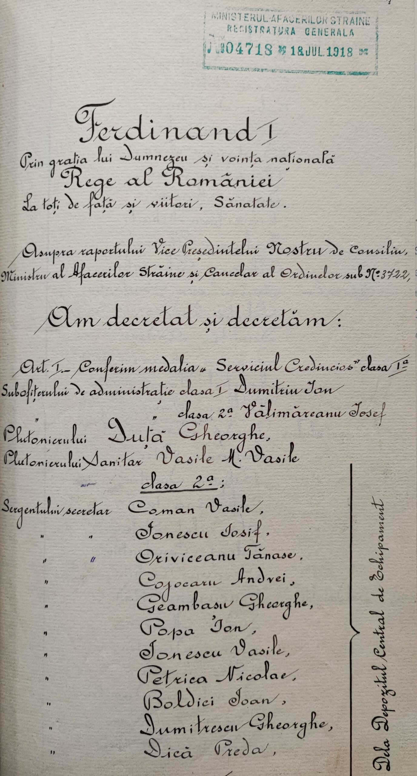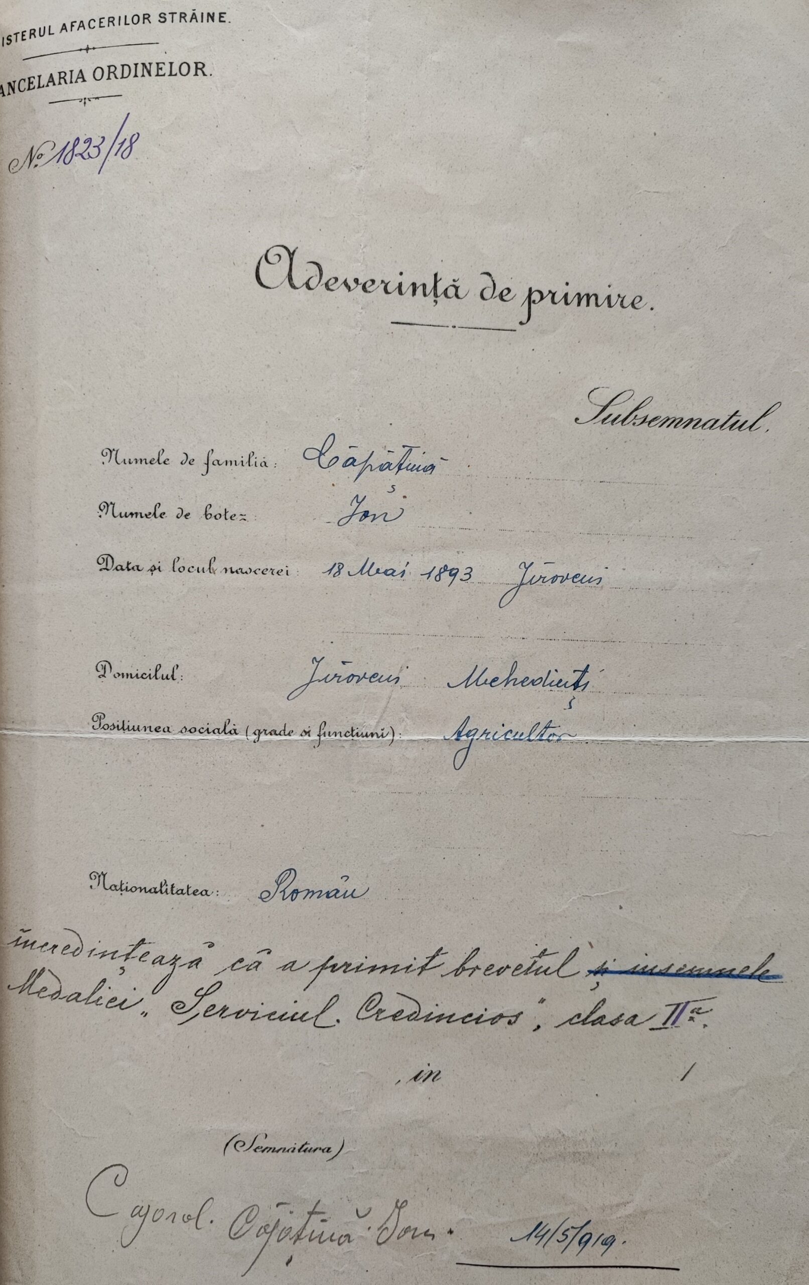 Urmare a raportului lui C. C. Arion, vicepreședintele Consiliului de Miniștri, ministrul Afacerilor Străine, cancelar al Ordinelor, nr. 3.722/1918, regele Ferdinand I a semnat în Bicaz, la 18 iulie 1918, decretul nr. 1.823, prin care a conferit Medalia „Serviciul Credincios” clasa a II-a caporalului Căpățână Ion, de la Depozitul Central de echipament. Potrivit adeverinței de primire a brevetului Medaliei „Serviciul Credincios” clasa a II-a, Căpățână Ion s-a născut la 18 mai 1893, în Jiroveni, Mehedinți, era agricultor și își avea domiciliul în aceeași localitate. Prin același act normativ, decorația a mai fost acordată și altor persoane atât la clasa de mai sus, cât și la clasa I.