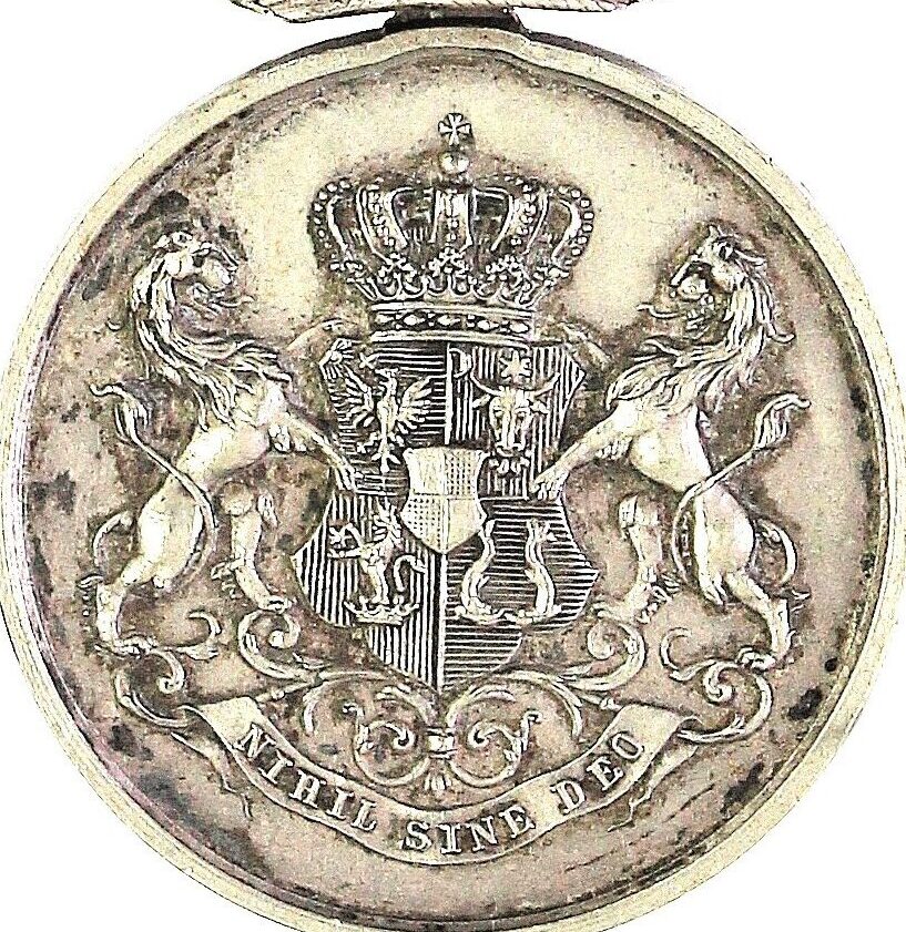 Medalia poartă la partea superioară coroana regală și un inel prin care se trece panglica. Panglica este de moar albastru-deschis, cu câte o dungă de fir argintiu pe fiecare margine, panglica lată de 35 mm, și lungă în partea aparentă de 50 mm, și se fixează pe piept în toată lățimea ei, adică fără alte îndoituri decât cele de la extremități, de care, pe de o parte, se atârnă Medalia de panglică, iar pe de altă parte, panglica de piept, căpătâiele panglicii prinzându-se cu copci de desubt”.