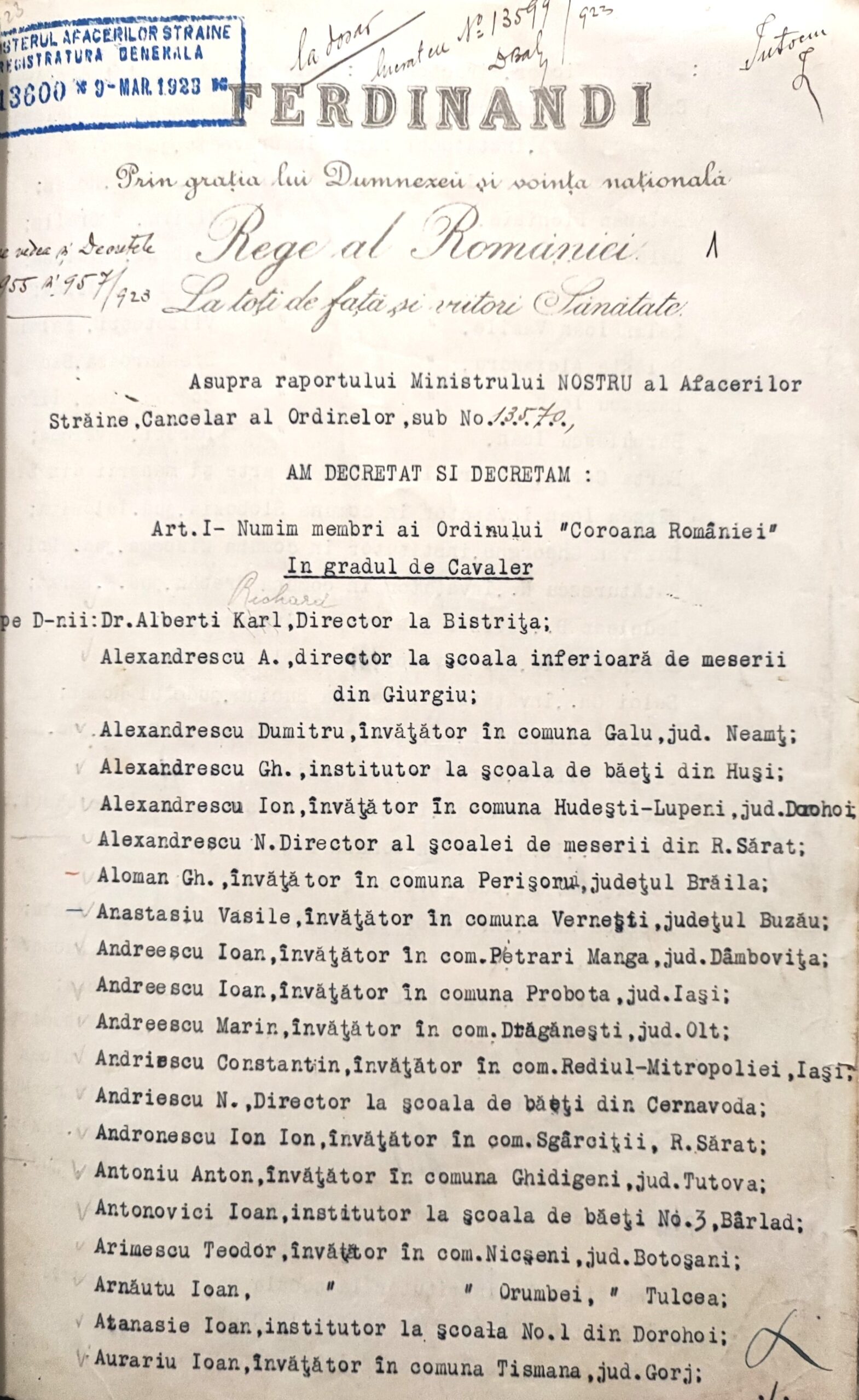 Urmare a raportului lui I. G. Duca, ministrul Afacerilor Străine, cancelar al Ordinelor, nr. 13.570 din 1923, regele Ferdinand I a semnat în București, la 9 martie 1923, decretul nr. 956, prin care a conferit lui Bungețianu D., institutor la Școala no. 1 din T. Severin, lui Botgros Vasile, învățător în comuna Corcova, județul Mehedinți, precum și altora, Ordinul „Coroana României” în gradul de Cavaler.