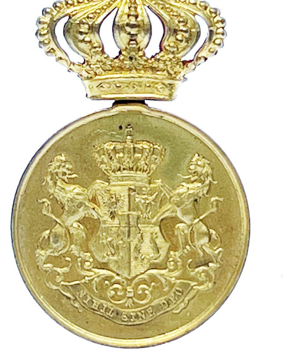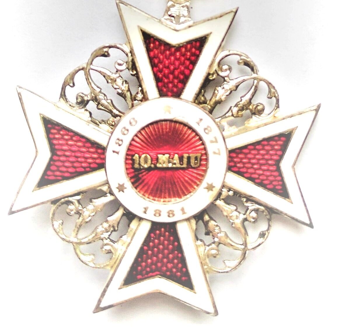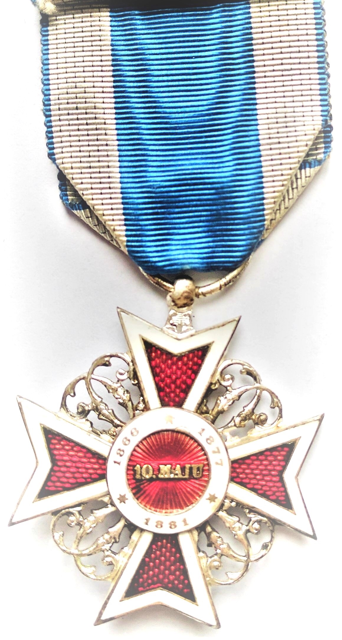 Pe smalțul roșu, în față, se află coroana regală, de oțel (făurită din metalul unuia dintre tunurile luate ca trofee de la inamic, în bătălia de la Plevna de la 28 noiembre 1877), iar pe cercul de smalț alb este scris, în partea de sus: PRIN NOI ÎNȘINE, iar în partea de jos: 14 MARTIE 1881 (data proclamării regatului). Reversul (dosul) medalionului poartă scris, la mijloc, pe smalțul roșu, în linie orizontală: 10 MAI (data încoronării) și împrejur, pe cercul de smalț alb: 1866-1877-1881 (datele respective ale suirii pe Tron, proclamării Independenței și proclamării Regatului).