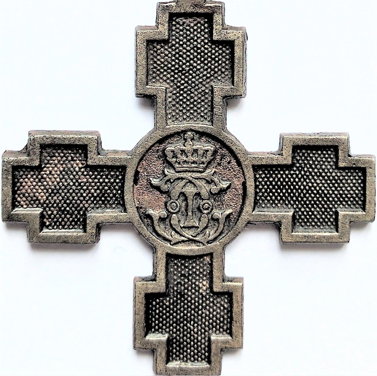 Crucea are pe marginile ramurilor o dungă albă în culoarea naturală a oțelului și în mijloc un medalion înconjurat de un cerc de oțel. Fondul medalionului este asemenea negru punctat și poartă pe o parte legenda: TRECEREA DUNĂRII și în mijloc milesimul 1877, pe cealaltă parte pe fondul medalionului se află cifra Noastră Domnească.