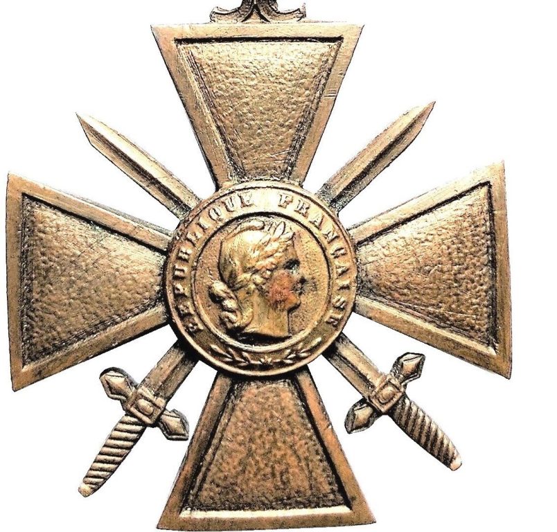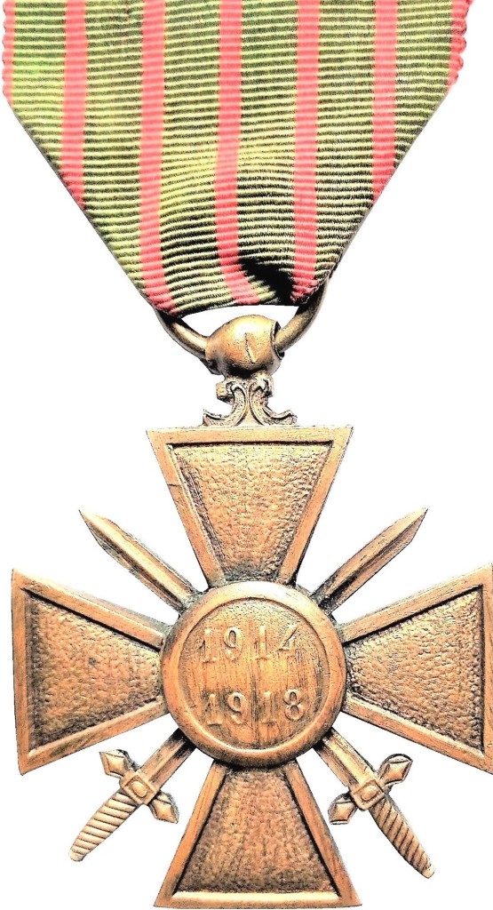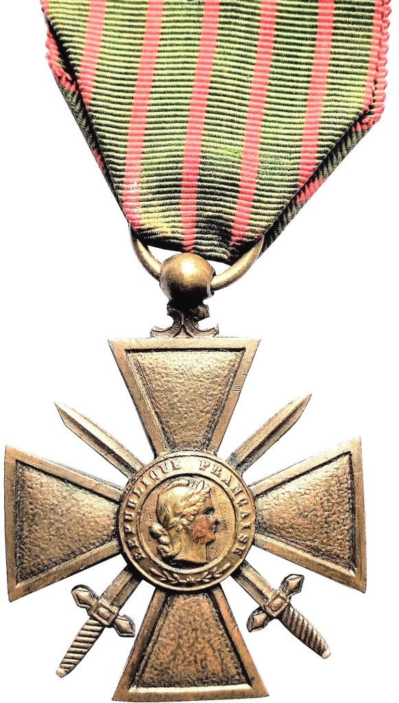 Crucea de Război (franceză) a fost instituită în aprilie 1915 și se acorda pentru purtare excepțională în timpul Primului Război Mondial. Se prezintă ca o cruce de bronz, cu brațele triunghiulare, având, pe centru, într-un medalion rotund, gravată în relief, efigia unui personaj feminin, privind spre dreapta, cu părul cârlionțat la spate, purtând bonetă frigiană și o coroană de la-uri pe frunte.