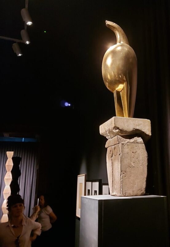 ile aparțin unor etape diferite ale traseului artistic al lui Constantin Brâncuși, considerat creatorul sculpturii moderne (care refuza să fie încadrat în vreun curent artistic), datorită contribuției sale revoluționare la înnoirea limbajului și a viziunii plastice în sculptură. Sunt prezente atât lucrări din perioada sa românească, influențate de stilul academic al Școlii de Arte Frumoase din București, cât și sculpturi ce țin de arta modernă (prin care încerca să reprezinte esența ființelor, lucrurilor și a fenomenelor), multe realizate, însă, prin metoda arhaică a cioplirii directe, ce denotă influența primitivismului („Eu, cu noul meu, vin din ceva care este foarte vechi”, spunea artistul). Acest caracter ambivalent, modern și arhaic totodată, caracterizează multe dintre creațiile sale, creând o atmosferă de mister în jurul lor, amplificată, în expoziție, de semiîntunericul din sălile muzeului.
