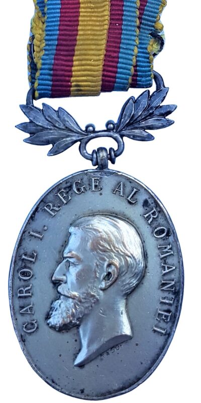 Ele poartă pe o parte, în relief, efigia regelui Carol I, înconjurată de cuvintele: CAROL I REGE AL ROMÂNIEI, iar pe cealaltă, stampată de asemenea în relief, pe trei rânduri, inscripția: BĂRBĂȚIE / ȘI / CREDINȚĂ și o ghirlandă de lauri. Medaliile se poartă atârnate printr-un inel format din două ramuri de lauri, de o panglică de mătase ripsată, lată de 30 mm și compusă la mijloc dintr-o bandă de culoare galben-deschis, lată de 18 mm, având în fiecare margine câte o bandă albastră și roșie, late fiecare de 3 mm. Medalia se poartă pe partea stângă a pieptului”.