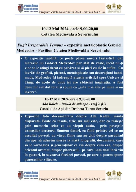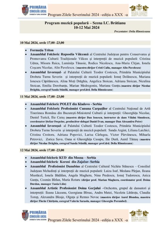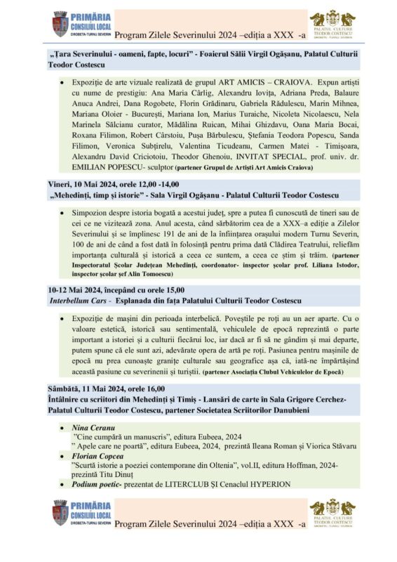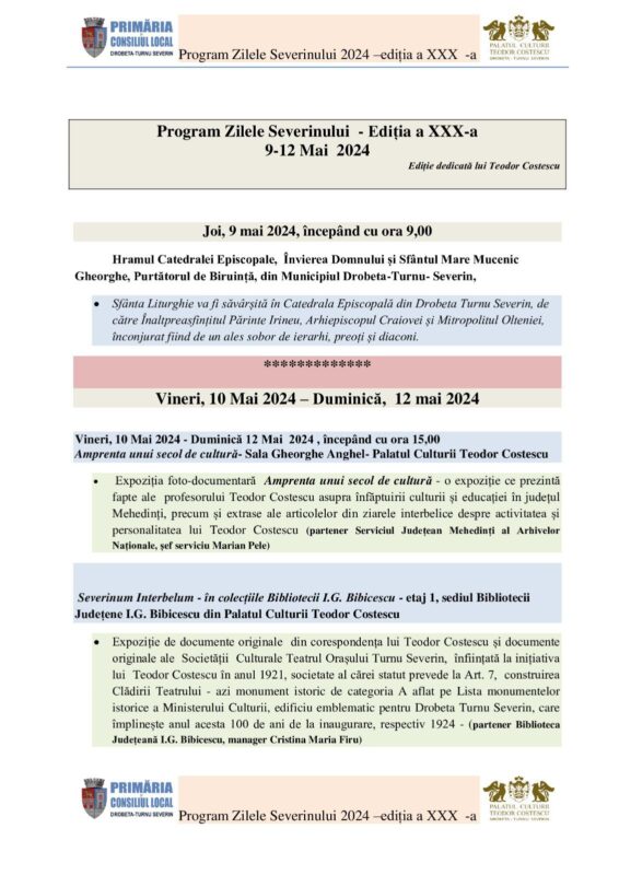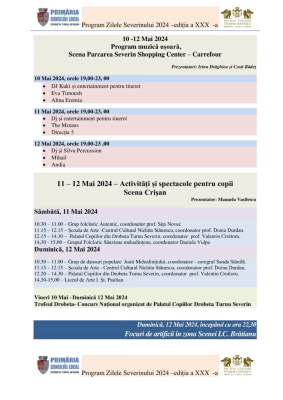 stiri Program Zilele Severinului 10-12 Mai 2024 stjust 4 mai 20245 mai 2024 Share Post Share Print Navigare în articole BAZINUL DE ÎNOT, INAUGURAT DE ZIUA TINERETULUI Medalia „Serviciul Credincios” decernată în 1907 unor jandarmi rurali din Compania Mehedinți Related Posts Final de an școlar la Penitenciarul Drobeta Turnu Severin Educație cu sens, chiar și în spatele zidurilor Penitenciarul Drobeta Turnu Severin marchează încheierea anului… 3 iulie 20257 iulie 2025 Șoferii din România pot folosi imaginile surprinse de camerele de bord Șoferii din România pot folosi imaginile surprinse de camerele de bord pentru a reclama comportamente… 14 aprilie 2026 AJOFM – Comunicat de presă / privind sistemul asigurărilor pentru șomaj și stimularea ocupării forței de muncă ̆, ̦̂̆̆ ̂… 24 martie 2026 Lasă un răspuns Anulează răspunsulAdresa ta de email nu va fi publicată. Câmpurile obligatorii sunt marcate cu *Comentariu * Nume * Email * Site web Salvează-mi numele, emailul și site-ul web în acest navigator pentru data viitoare când o să comentez. Δ